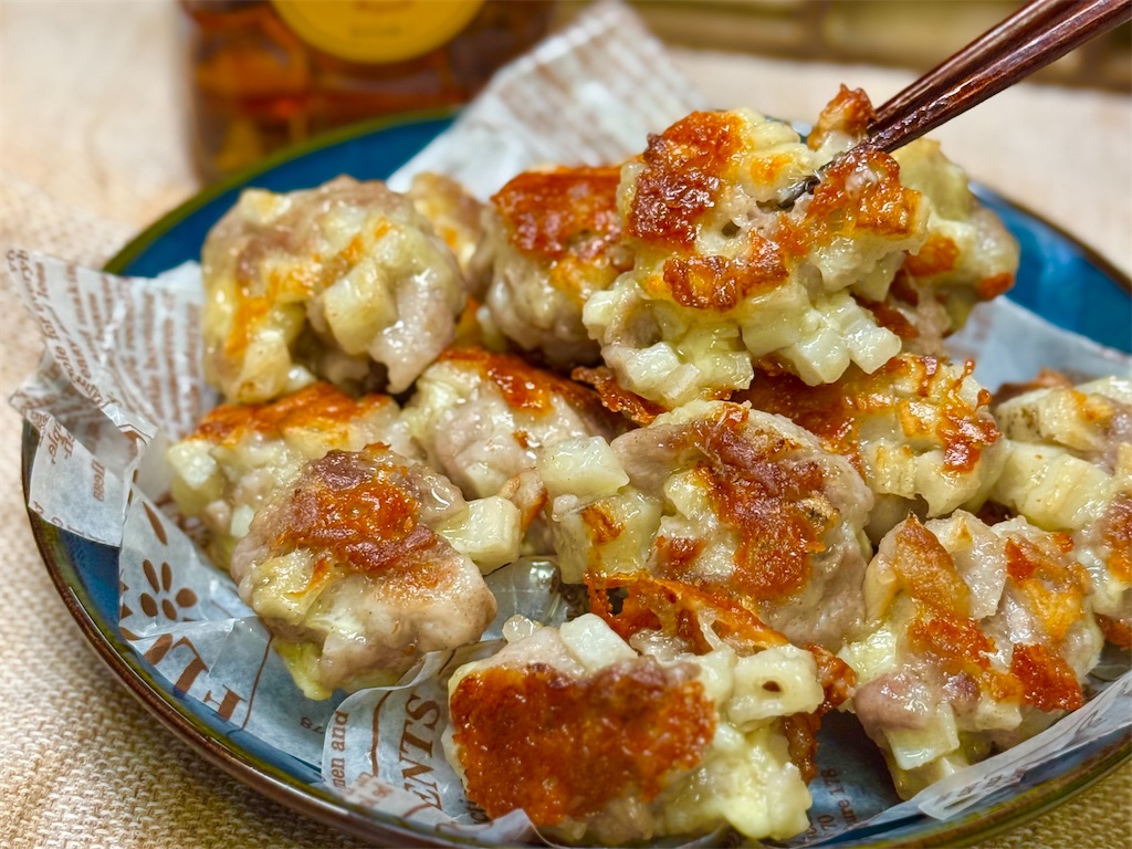 ギュッと丸めてカリカリに焼き上げた豚こまとれんこんに香ばしいチーズが相性抜群です♬